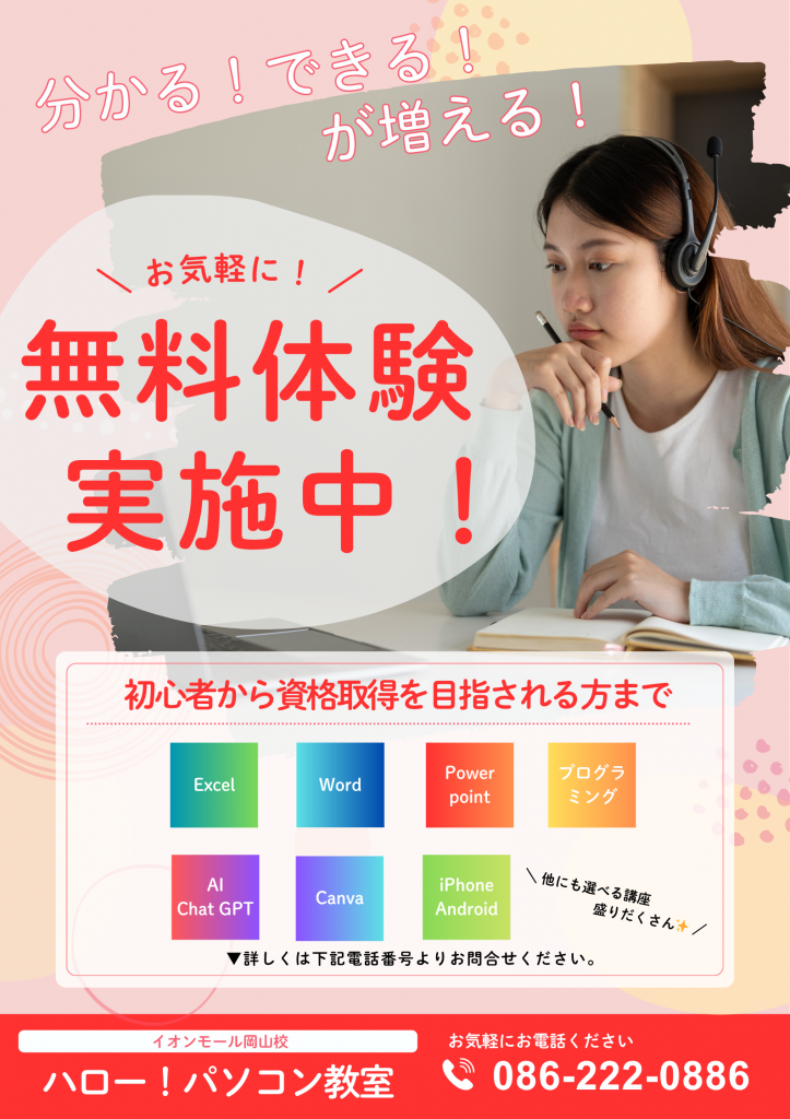 今回はCanvaを使ってハロー!パソコン教室 イオンモール岡山校のチラシを作成してみました!